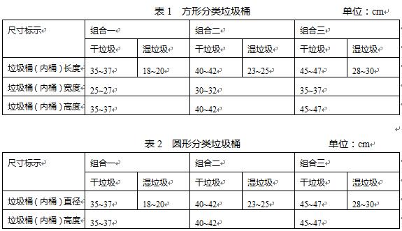家用分类垃圾桶应满足居民家庭日常生活垃圾干、湿分类投放要求、成组设计,制作成分体式分类垃圾桶;应按照上海市生活垃圾分类标志标识管理规范,干垃圾桶体采用黑色、湿垃圾桶体采用棕色,并在桶体正面或顶盖印刷上海干湿分类名称与图形标识;应无破裂,表面规整,不允许有明显波纹、划伤、杂质、气泡和熔合线个定时定点投放垃圾房改造