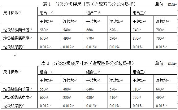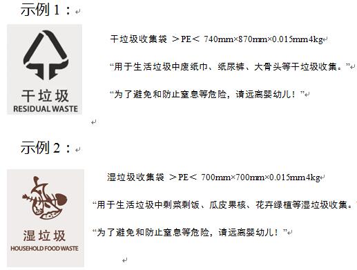 家用分类垃圾袋应分别标识垃圾袋名称、材质、规格尺寸(标称有效长度、标称有效宽度和标称厚度)、标称承重,并按照上海地方分类标识标志管理规范,在垃圾袋包装说明上用文字或图标说明,以及安全警示性文字等。