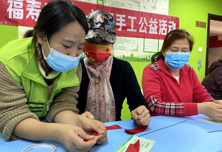 知识竞赛结束后,老师向大家发放手工材料,并详细介绍了活动的内容、具体操作步骤以及注意事项,鼓励阿姨们充分发挥自己的动手能力和想象力,在制作中体验创作乐趣。对于这项新奇的手工制作,阿姨们都充满兴趣,迫不及待地动起手来。有阿姨向老师请教,老师感觉到阿姨的手很凉,阿姨笑笑说:“我的心可是火热的!”把在场的老师和阿姨们逗得哈哈大笑。