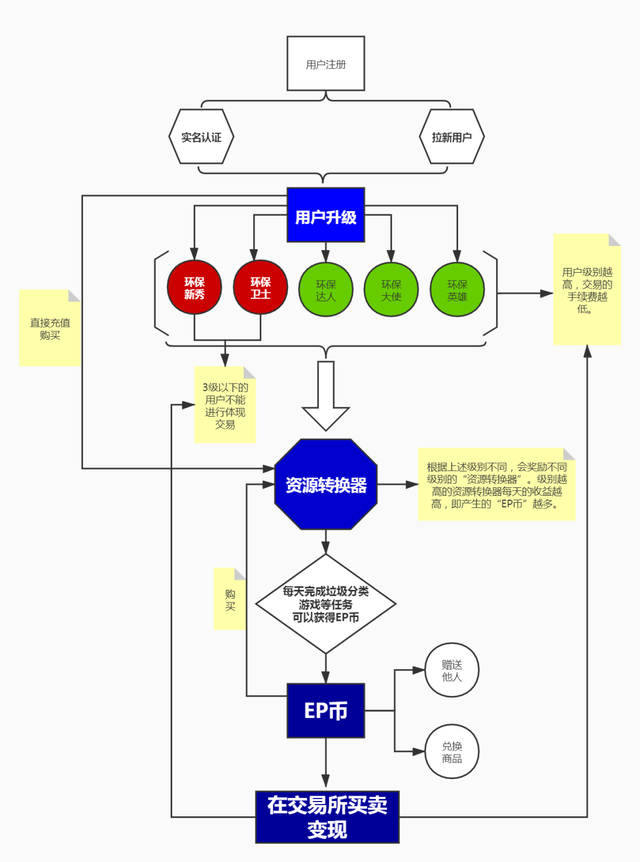 “EP环境保护”的会员分为四个级别,由低到高,分为环保新秀、环保达人、环保大使、环保英雄。级别越高,获得的资源转换器越高级。高级别的资源转换器处理垃圾的能力也越强,产生EP币的能力也越强。