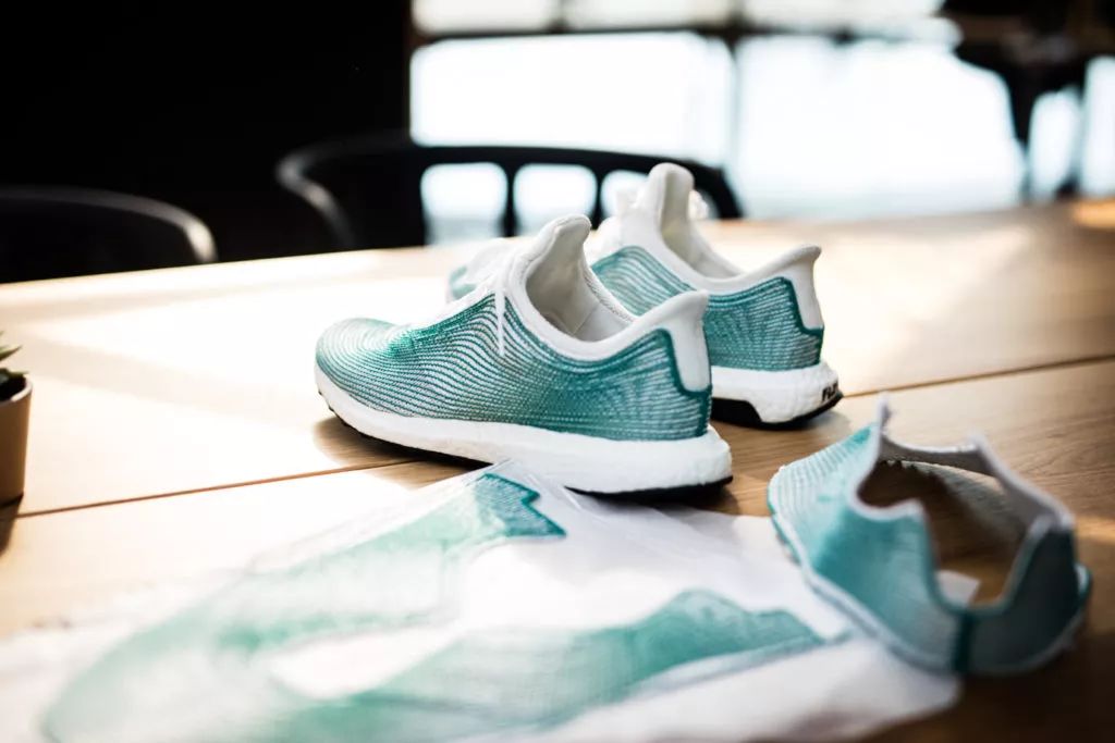 他们在南太平洋收集了大量海洋塑料垃圾,结合非法偷猎船只上收缴的渔网,加工制成全新的材料,来作为鞋子的表面。其蓝绿的颜色,也是象征着海洋