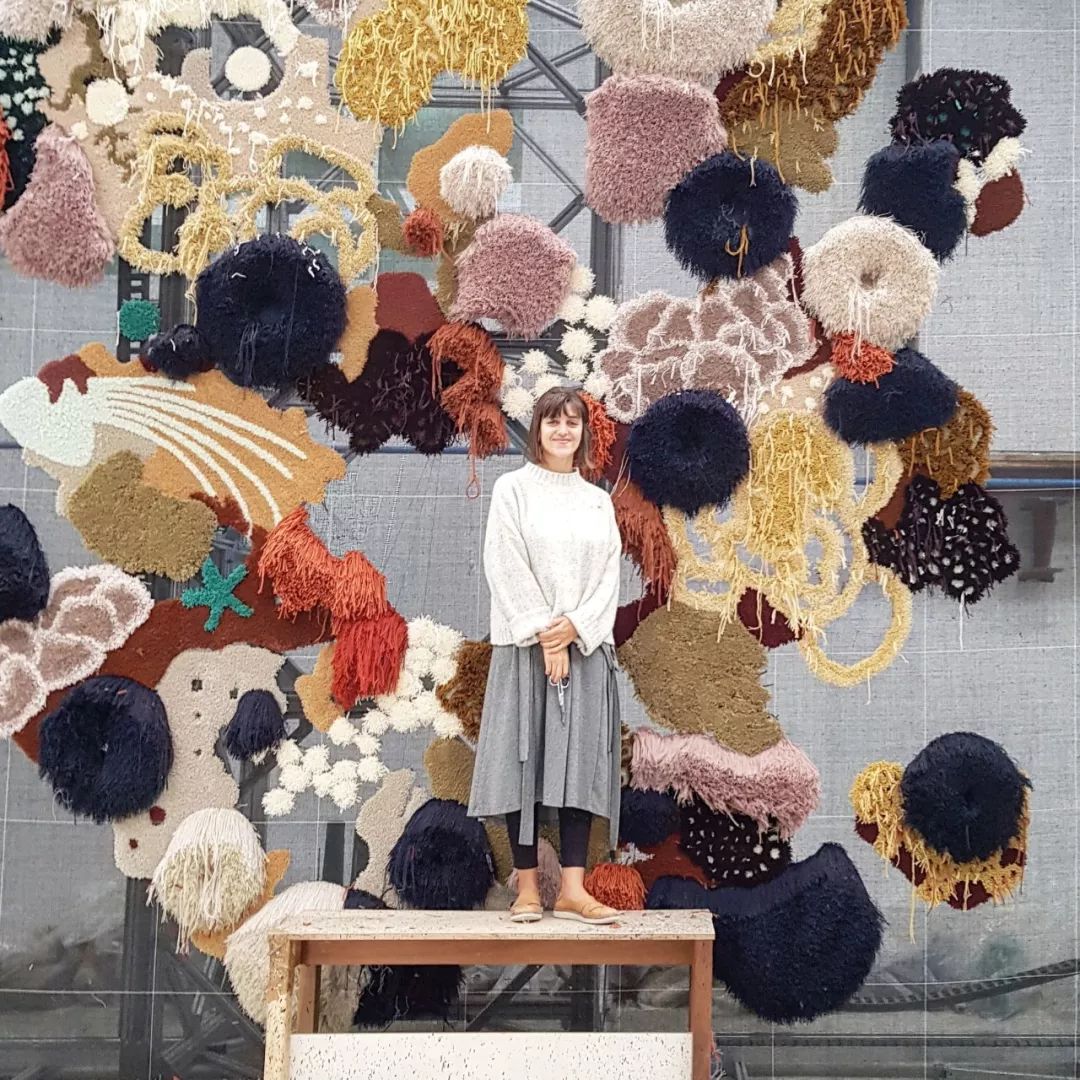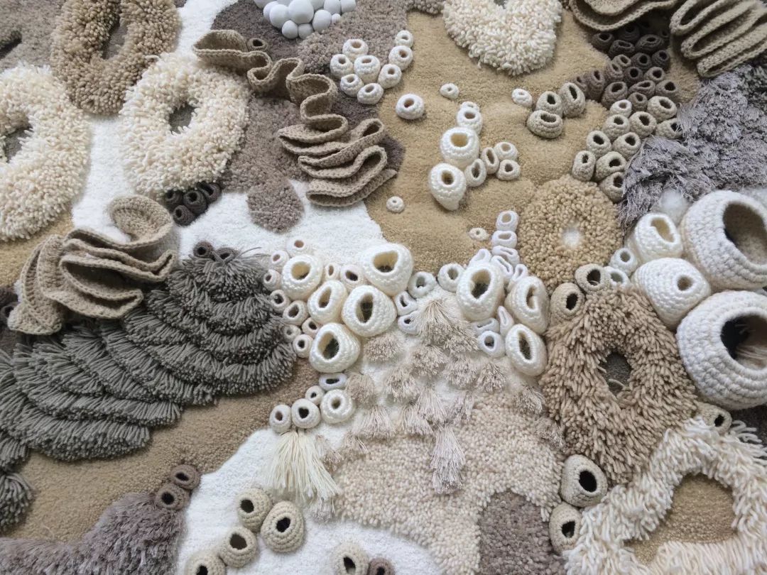 在她的手工作品中,你能感受到缤纷、栩栩如生的海底景观。对海洋的记忆,似乎也在此刻被唤醒合了刺绣、手工簇绒等传统工艺,令纱线呈现出丰富的立体层次