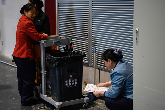 “亲,请打开我再扔哦!”今天,在第二届进博会临战综合演练现场,记者看到,国家会展中心的垃圾分类投放点上,干垃圾、湿垃圾、可回收物……分类收集垃圾桶被合理地安放在各个展馆内,方便展商和观众投放,还配有保洁人员在展馆周边巡查落地垃圾。